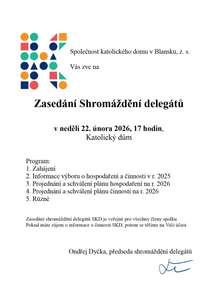 Zveme všechny ze Shromáždění delegátů, členy spolku a i budoucí členy na Zasedání shromáždění delegátů, které se koná v neděli 22. února 2026 v 17 hodin. Dozvíte se o činnosti SKD v minulém roce a o plánech na tento rok a roky další.